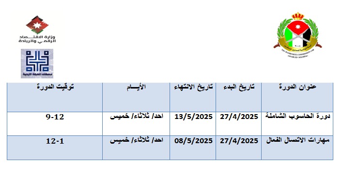 تعلن الهيئة الهاشمية للمصابين العسكريين بالتعاون مع وزارة الاقتصاد الرقمي والريادة ومن خلال محطة المعرفة في مقر الهيئة الرئيسي في عمان عن عقد دورة "الحاسوب الشاملة" ودورة "مهارات الاتصال الفعال" للمصابين العسكريين وذويهم القاطنين في محافظات إقليم الوسط (عمان، البلقاء، الزرقاء، مادبا).